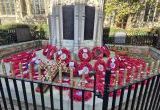 Wreaths by the war memorial outside All Saints' church in Maldon, following the church's Remembrance Day service on 10th November 2024.